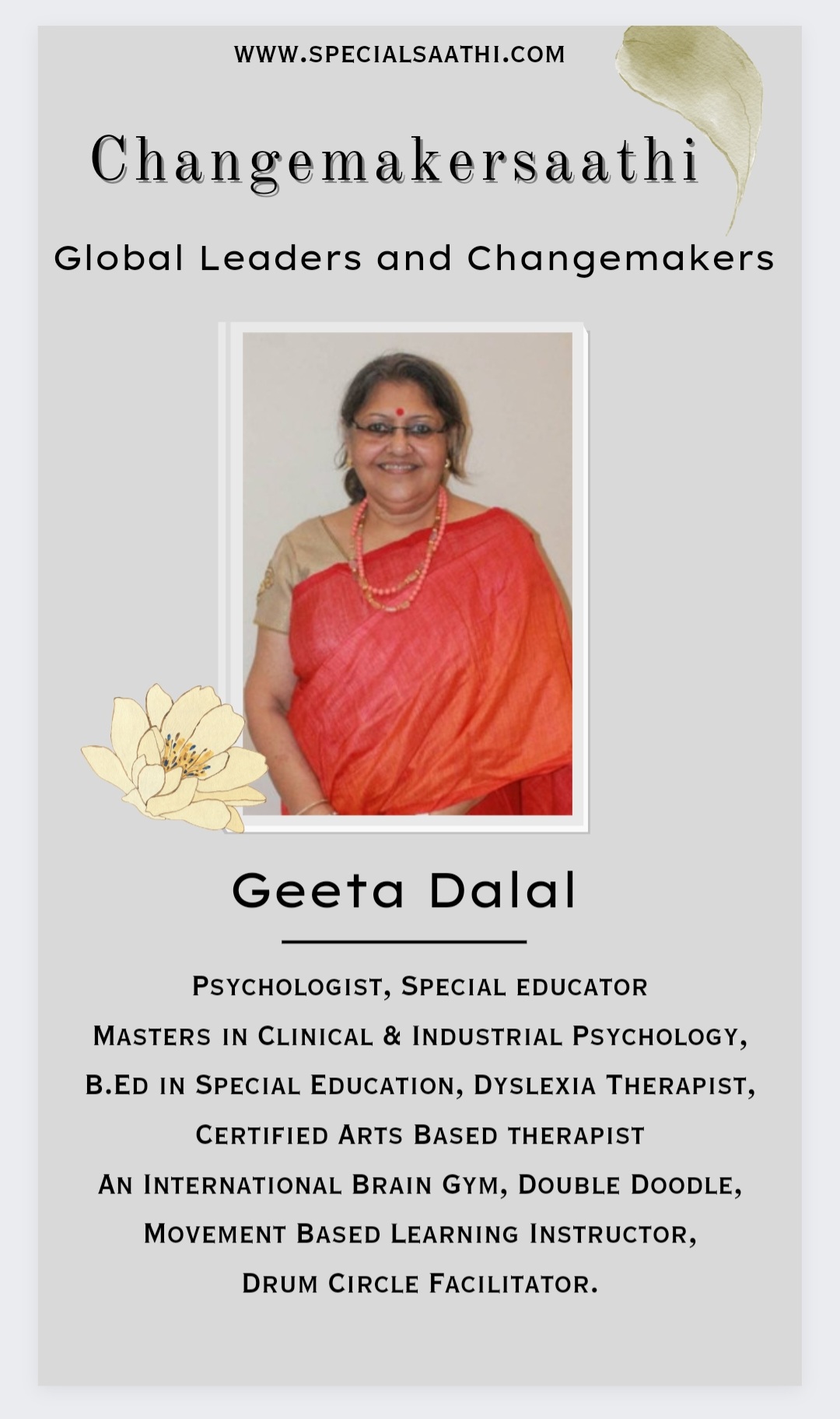 Let’s hear Geeta’s story and her journey in her own words. Presenting Ms.Geeta Dalal’s talk with Ms.Shilpi Mayank Awasthi Founder of SpecialSaathi ..