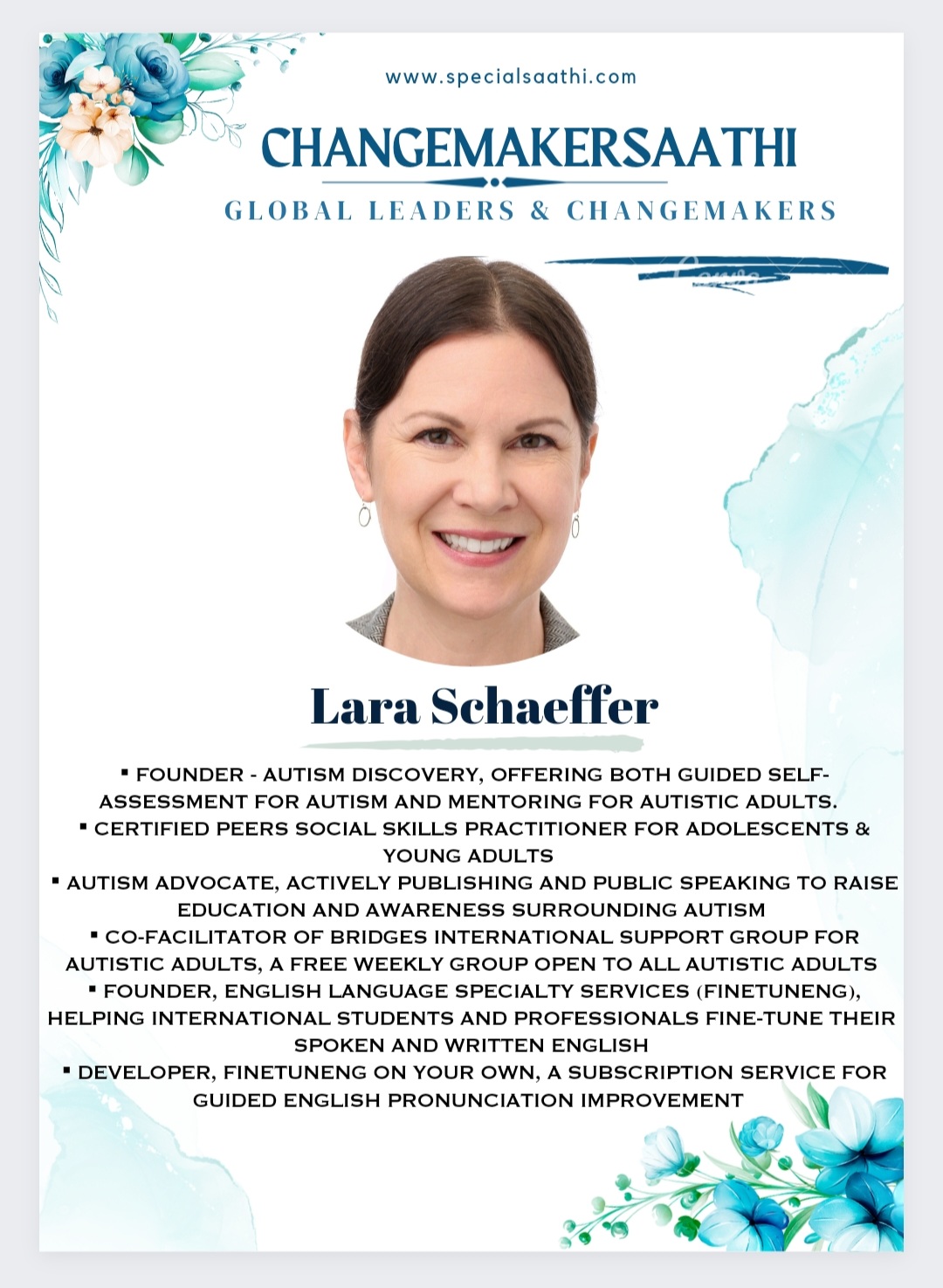 Lara Stanton Schaeffer stands as a beacon of hope and change in the global community. Through her organizations, Autism Discovery and finetunENG, she champions the rights and potential of autistic adults while also bridging cultural divides through language empowerment. Lara’s commitment to transforming lives, fostering acceptance, and driving social change serves as an inspiration to all. As a visionary leader and compassionate advocate, Lara Stanton Schaeffer’s contributions resonate far and wide, leaving an indelible mark on our society and paving the way for a brighter and more inclusive future.