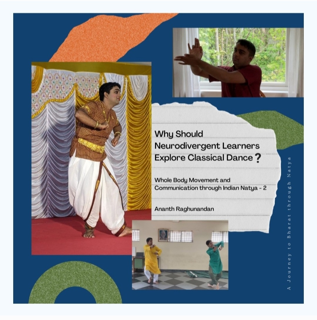 Classical dance has been a wonderful learning opportunity for me. I am grateful to my gurus Smt. Harija Sivakumar, Professor Kalakshetra Mohanan, and Sri Ujwal Jagadeesh for teaching me Bharatanatyam for many years. The structured and systematic way of learning and practice works well for me. Adavus, hastas, and bedas are three building blocks of Bharatanatyam. By practicing these building blocks regularly, I can learn the dance pieces more easily. I encourage neurodivergent students and their parents to explore classical dance.